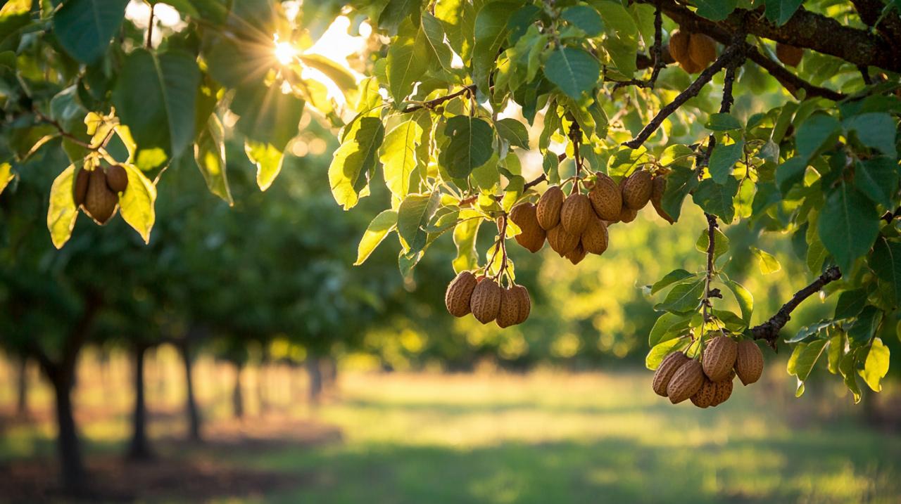 Le pacanier se distingue par sa stature impressionnante et sa longévité exceptionnelle. Cet arbre peut atteindre des hauteurs considérables et vivre jusqu'à 300 ans, produisant plusieurs kilogrammes de fruits chaque saison. Son écorce caractéristique et son feuillage dense en font un élément paysager remarquable. Le cycle végétatif du pacanier est marqué par une floraison printanière discrète suivie d'une fructification automnale généreuse. La pacane, son fruit, est enfermée dans une coque de forme oblongue qui se fend naturellement à maturité pour libérer l'amande délicieuse qu'elle protège. Ces coques, lorsqu'elles sont intactes et ne font pas de bruit quand on les secoue, indiquent généralement des noix de qualité optimale.